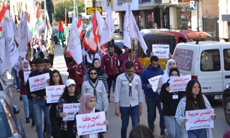 وختم:” ان شباب الأمة مسؤول أمام الله والتاريخ عن تحرير فلسطين والدفاع عن مقدساتها والوقوف الى جانب شعبها البطل، إننا مؤمنون على نهج خاتم الانبياء والمرسلين سيدنا محمد عليه الصلاة والسلام، وإيماننا يفرض علينا أن نقدم ما نستطيع من أجل الأقصى والقدس، ونحن عرب وإنتماؤنا القومي يفرض علينا التمسك بكل حبة تراب من فلسطين العربية،إننا لبنانيون، ووطنيتنا تدفعنا للوقوف الى جانب إخوتنا المظلومين الذين يعانون الاحتلال والعدوان كما نصرة أهل الجنوب ايضاً في مواجهة اعتداءات الصهاينة على قراهم وبلداتهم، فالتحية ايضاً للجنوب الصامد ولكل مقاوم حر شريف في هذه الامة من فلسطين الى لبنان والعراق واليمن، نعم للجهاد والمقاومة،في سبيل تحرير الارض والمقدسات فما أخذ بالقوة لا يسترد الا بالقوة”.