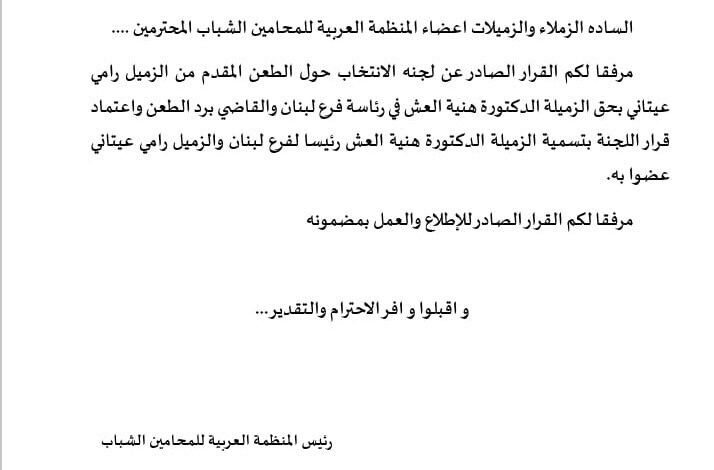 المنظمة العربية للمحامين الشباب ردت طعن المحامي العيتاني واكدت صحة فوز المحامية العش برئاسة فرع لبنان