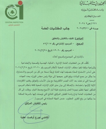 أصدر رئيس التفتيش المركزي القاضي جورج عطية تكليفا بالتفتيش لكلّ من المفتشيّات العامة الادارية، المالية، الهندسيّة والصحيّة والاجتماعيّة والزراعيّة رقم ٢٦٦/ ص٢ ٢٠٢٤، تاريخ ١١/٠٣/٢٠٢٤ ، لمراقبة التزام مختلف الادارات المعنية بتنفيذ احكام المرسوم رقم ١٣٠٢٠ تاريخ ٢٨/٠٢/٢٠٢٤، ولتحديد الجهات الرسمية التي لم تعتمد بعد آلات البصم الالكترونية مع بيان الاسباب والعوائق وتقديم الاقتراحات الآيلة لالزامها باعتمادها، بالاضافة الى بيان مدى التزام الادارات المعنية بتنظيم ديمومة العمل واستمراره طيلة ايام الاسبوع وضبط الدوام والحضور، على أن تودع المفتشيات العامة المشار اليها رئاسة التفتيش المركزي النتائج التي تتوصل اليها بالسرعة الممكنة بما يمكّنها من جمع البيانات ورفع تقرير بموجبها الى دولة رئيس مجلس الوزراء.