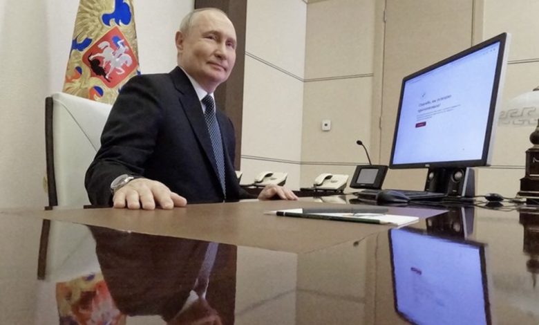 وبدا بوتين يسير في اتجاه مكتب ثم يجلس قبالة كمبيوتر وأمامه علمان روسيان قبل أن تظهر رسالة مكتوبة على الشاشة مفادها “شكرا، لقد صوتّم بنجاح”.