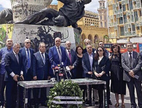 إكليل غار من نقابتي الصحافة والمحررين على قاعدة تمثال الشهداء في بيروت