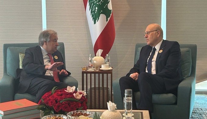 ميقاتي التقى غوتيريش على هامش قمة المنامة وطالب بالضغط على اسرائيل لوقف عدوانها