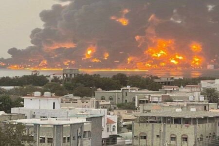 ونشر ناشطون مقاطع فيديو في مواقع التواصل تظهر حرائق هائلة قالوا إنها ناتجة عن غارات إسرائيل على ميناء الحديدة.
