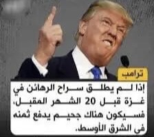 اجل فقد كشر هذا المجنون عن انيابه وهدد بجحيم في الشرق الأوسط مباشرة بعد جلوسه على كرسي الحكم للمرة الثانية إن لم يتم إطلاق كل رهائن إسرائيل لدى سلطات حركة حماس .