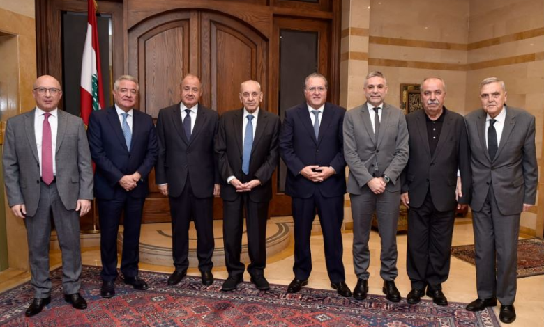 الرئيس بري استقبل أيضاً وفداً من الهيئات الإقتصادية ضم الوزير السابق محمد شقير، رئيس المجلس الإقتصادي الاجتماعي شارل عربيد، نقيب المحامين فادي المصري، نقيب المهندسين فادي حنا، نقيب الأطباء يوسف بخاش ونائبي رئيس الإتحاد العمالي العام سعد الدين حميدي صقر وحسن فقيه، وتناول اللقاء المستجدات السياسية والأوضاع العامة لاسيما الاقتصادية والمعيشية منها.