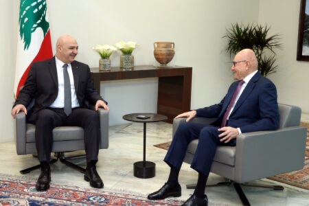 وفي هذا الإطار، استقبل الرئيس عون امس في قصر بعبدا الرئيس نجيب ميقاتي وعرض معه لاخر المستجدات على الساحة اللبنانية وتطورات الوضع في الجنوب. وخلال اللقاء، شكر رئيس الجمهورية الرئيس ميقاتي على الجهود التي بذلها خلال توليه رئاسة الحكومة في فترة صعبة من تاريخ لبنان لا سيما خلال مرحلة الفراغ الرئاسي، منوها خصوصا بمواقفه حيال المؤسسة العسكرية والدور الذي لعبه لتحقيق وقف إطلاق النار خلال العدوان الإسرائيلي الأخير على لبنان.