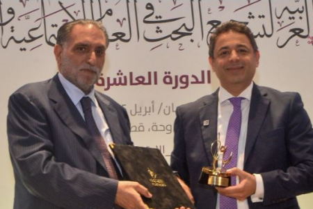 وقد تم إعلان فوز الدكتور منصوري خلال حفل ختام أعمال الدورة العاشرة من “مؤتمر العلوم الاجتماعية والإنسانية” الذي نظمه المركز العربي في العاصمة القطرية الدوحة، بمشاركة نخبة من الباحثين العرب وحضور وزيرة التربية والتعليم العالي في دولة قطر لولوة بنت راشد محمد الخاطر التي قامت بتسليم الجائزة للفائزين.