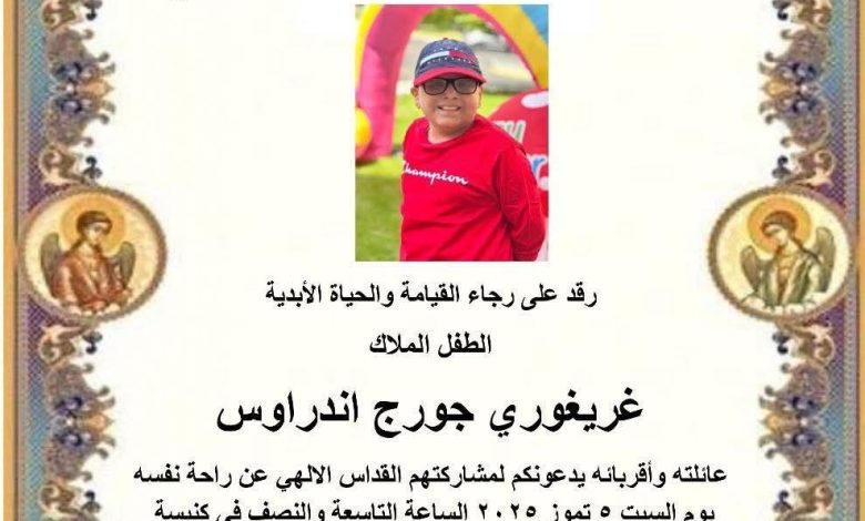 تتقبل العائلة التعازي بعد القداس الالهي الذي سيقام لراحة نفسه وذلك يوم السبت الواقع فيه ٥ تموز ٢٠٢٥ الساعة التاسعة والنصف صباحاً في كنيسة القديس جوارجيوس في كفرعقا .