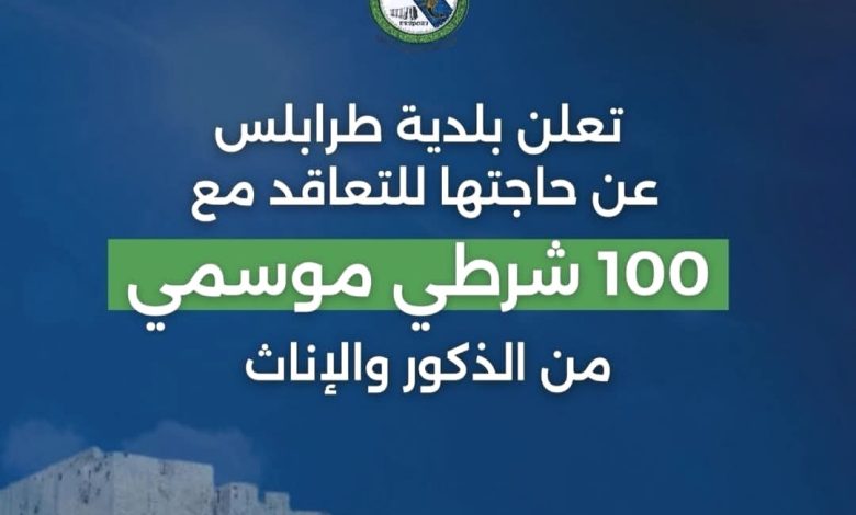 تعلن بلدية طرابلس عن حاجتها للتعاقد مع 100 شرطي موسمي من الذكور والإناث
