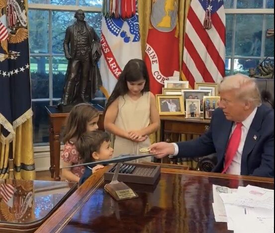 كما قدم ترامب للأطفال “عملات التحدي” التذكارية، وأنهى اللقاء بتقديم أقلام من مكتبه قائلًا: “هل تريدون قلمًا؟”، وفق مصادر في البيت الأبيض، موضحة أن الأطفال كانوا ضمن جولة قصيرة للسلام على الرئيس.