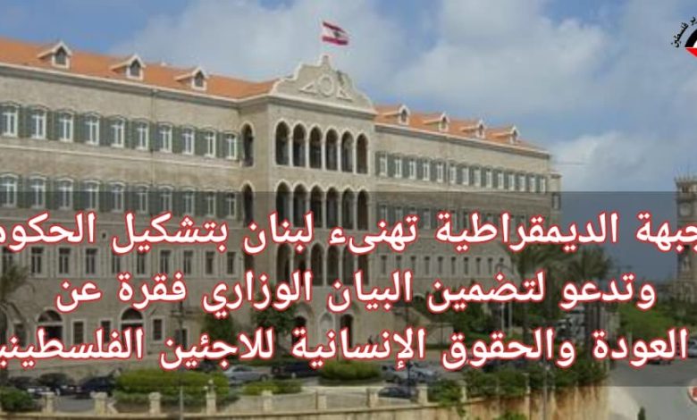 الجبهة الديمقراطية تهنىء لبنان بتشكيل الحكومة وتدعو لتضمين البيان الوزاري فقرة عن حق العودة والحقوق الإنسانية للاجئين