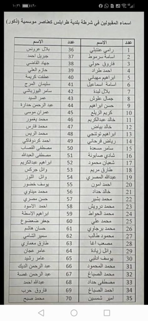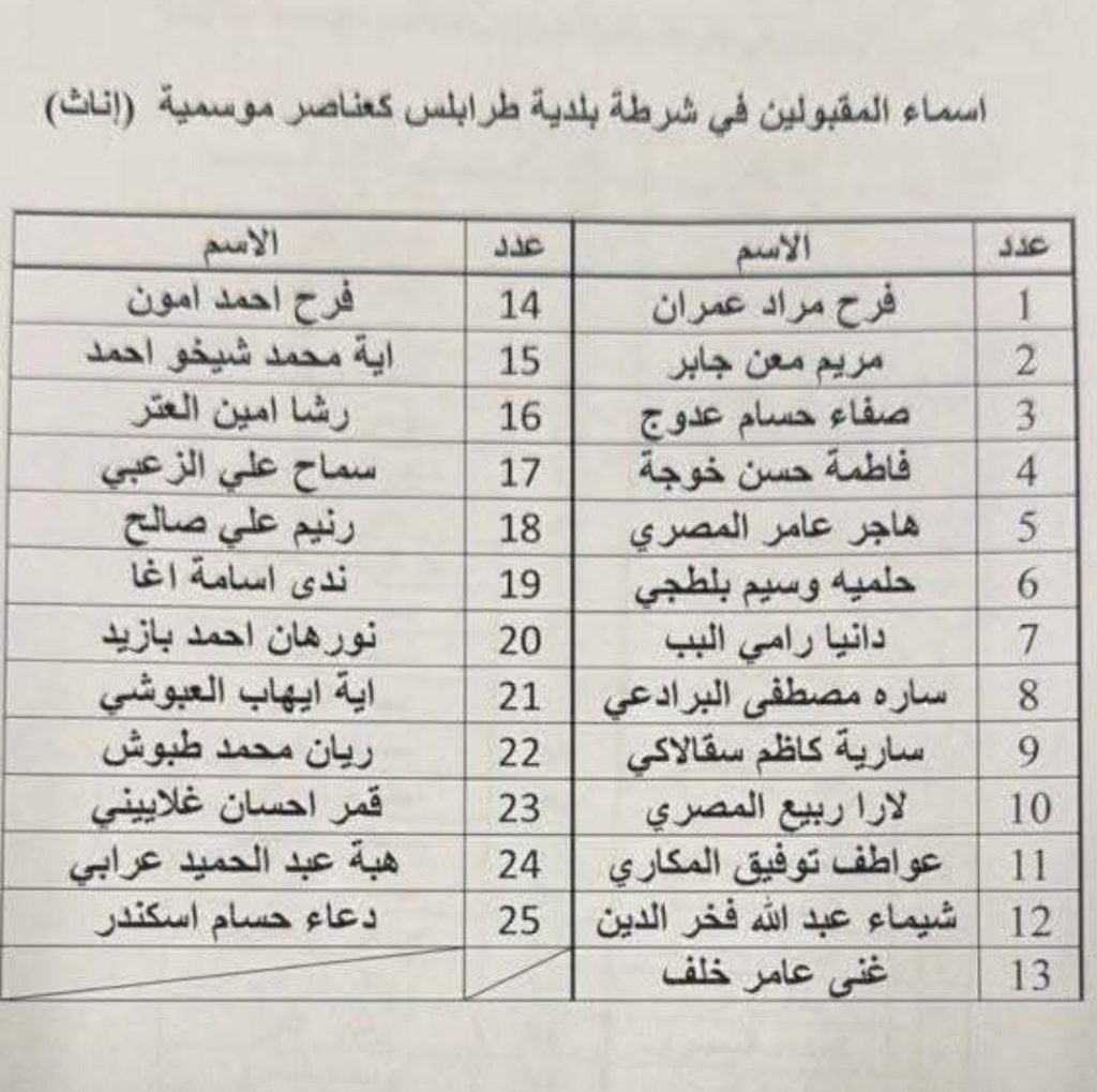 أعلنت بلدية طرابلس أسماء المقبولين في الشرطة البلدية الموسمية، من الاناث والذكور وذلك وفقًا للأصول القانونية المعتمدة.